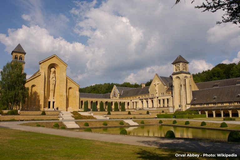 Numerous websites have recounted the fabled tale behind the creation of the logo. Here, I present a condensed retelling: During the 11th century, Countess Matilde of Tuscany embarked on a visit to the Gaume valley, now home to a modern-day monastery in Belgium. As a sorrowful widow wandering through the meadows, she found herself at a lake (some sources argue it was a fountain) where she took a moment to contemplate. Unintentionally, her cherished wedding ring slipped from her finger and plunged into the water. In a fervent plea, she beseeched the Lord for its return. To her astonishment, a miraculous occurrence unfolded before her very eyes — a trout emerged from the depths, clutching her precious wedding ring in its mouth. Overwhelmed by this extraordinary event, the Countess exclaimed, “Truly this place is a Val d’Or!” (Val d’Or – Golden Valley). In an expression of gratitude towards the Lord, she proclaimed her intention to establish a monastery at that very location.